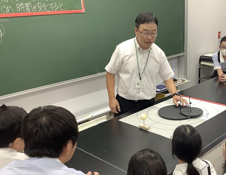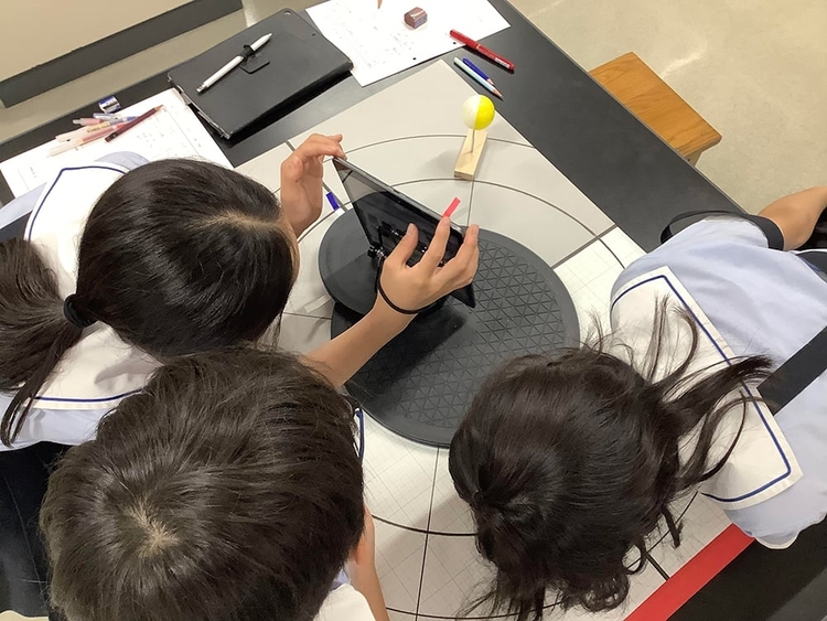 本校教員が新たに教材開発した「月の満ち欠けモデル」を子どもたちが操作することで、太陽・地球・月の位置関係を確かめながら、月の見え方や見える時間の変化を自分の言葉で説明しようとする姿が見られました。