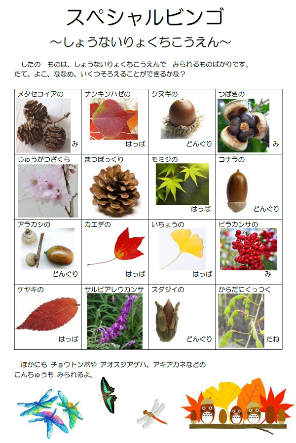 子どもたちは、どんぐりやまつぼっくり、落ち葉などを拾ったり、庄内緑地公園内で見られる秋の植物を見つける「庄内緑地スペシャルビンゴ」に挑戦したりしました。後日、拾ったどんぐり等で、秋の実りを活用した工作をする予定です。