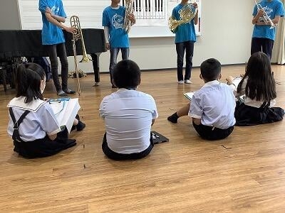 ブラスバンド部の皆さんは、目の前で本物の楽器を使ってお話をしてくださったり、実際に音を聴かせてくださったりと大変丁寧に説明をしてくださいました。4年生の子どもたちも熱心に耳を傾け、意欲的に質問するなど楽器の仕組みについて一生懸命学ぶ姿がたくさん見られました。
