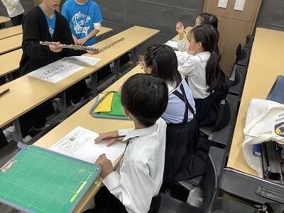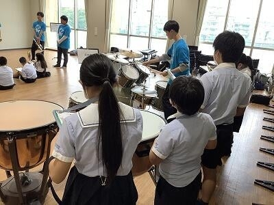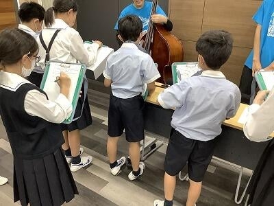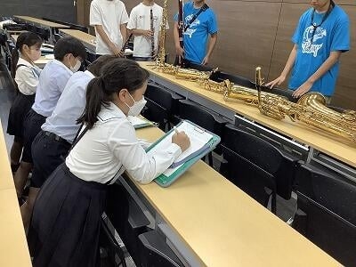 この学習は、オリジナル楽器をつくることを課題として取り組み始めましたが、楽器づくりを始める前に、楽器の仕組みを知ることが必要だという意見から楽器調べが始まりました。しかし、小学校の音楽室にある楽器は数も種類もあまり多くありません。そこで南山中学・高等学校男子部のブラスバンド部の皆さんにご協力していただき、楽器のことについて教えていただくことになりました。
