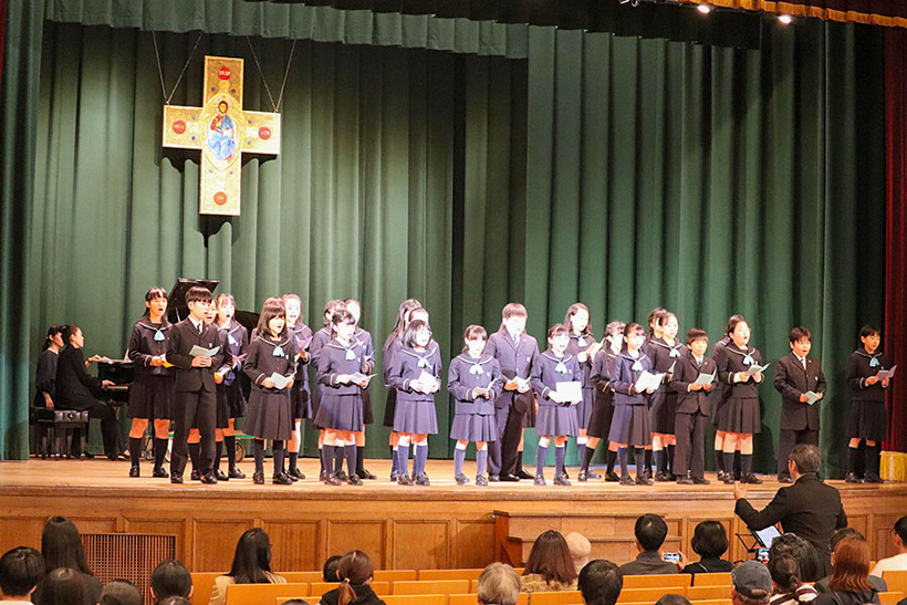 11月16日(日)に行われた「オータムフェスタ」(私学をよくする愛知父母懇談会・昭和ブロック主催)に、聖歌隊高学年グループが歌唱奉仕を行いました。「With You Smile」「カッチーニのアヴェ・マリア」「いのちの歌」の3曲を披露しました。その後は、南山男子部奇術部のお兄さんたちにお手玉やジャグリングなどを教えてもらい、楽しいひとときを過ごしました。