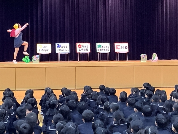 その後、愛知県警察防犯活動チーム「のぞみ」の方々に来校していただき、防犯教室を行いました。防犯対策として「大声を出す」「助けを呼ぶ」など、自分の身を助ける方法を劇の中でわかりやすく説明していただきました。