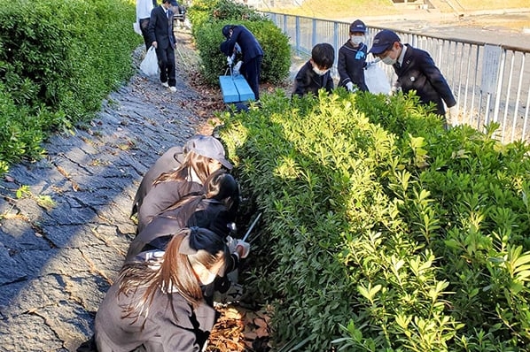 宗教曲を中心に愛らしい歌声を響かせる病院での歌唱奉仕、チャリティーコンサートや、保護者、教員とともに学校周辺の道路脇や植え込みの奥のごみを拾う地域清掃活動などを行っています。いつも見守ってくださる学校近隣地域に対し、奉仕と感謝の気持ちを込めて活動しています。